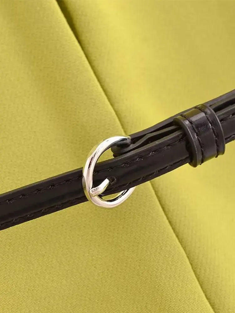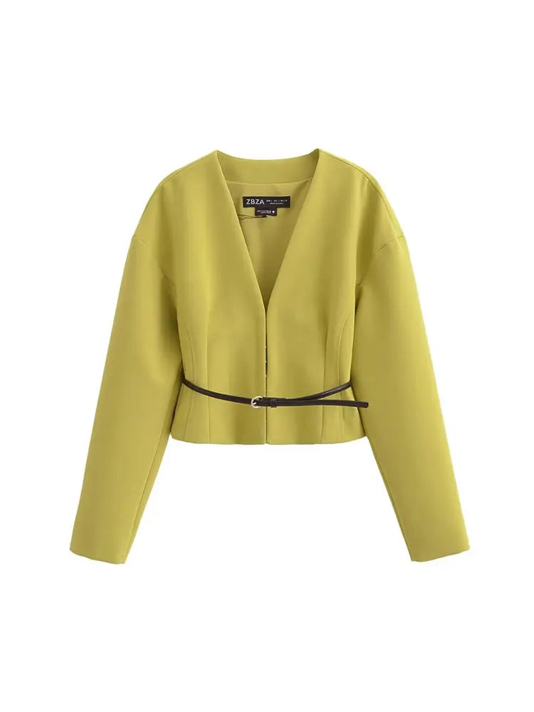 High-waist a line skirt with a belt and v-neck fitted blazer with belt featuring a hidden-fastening.