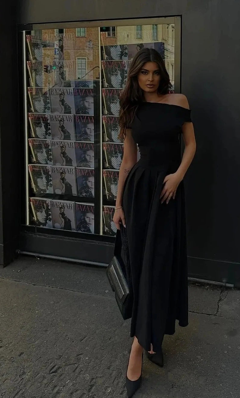Asymmetric long dress with pleated hemline featuring an off-the-shoulder design.